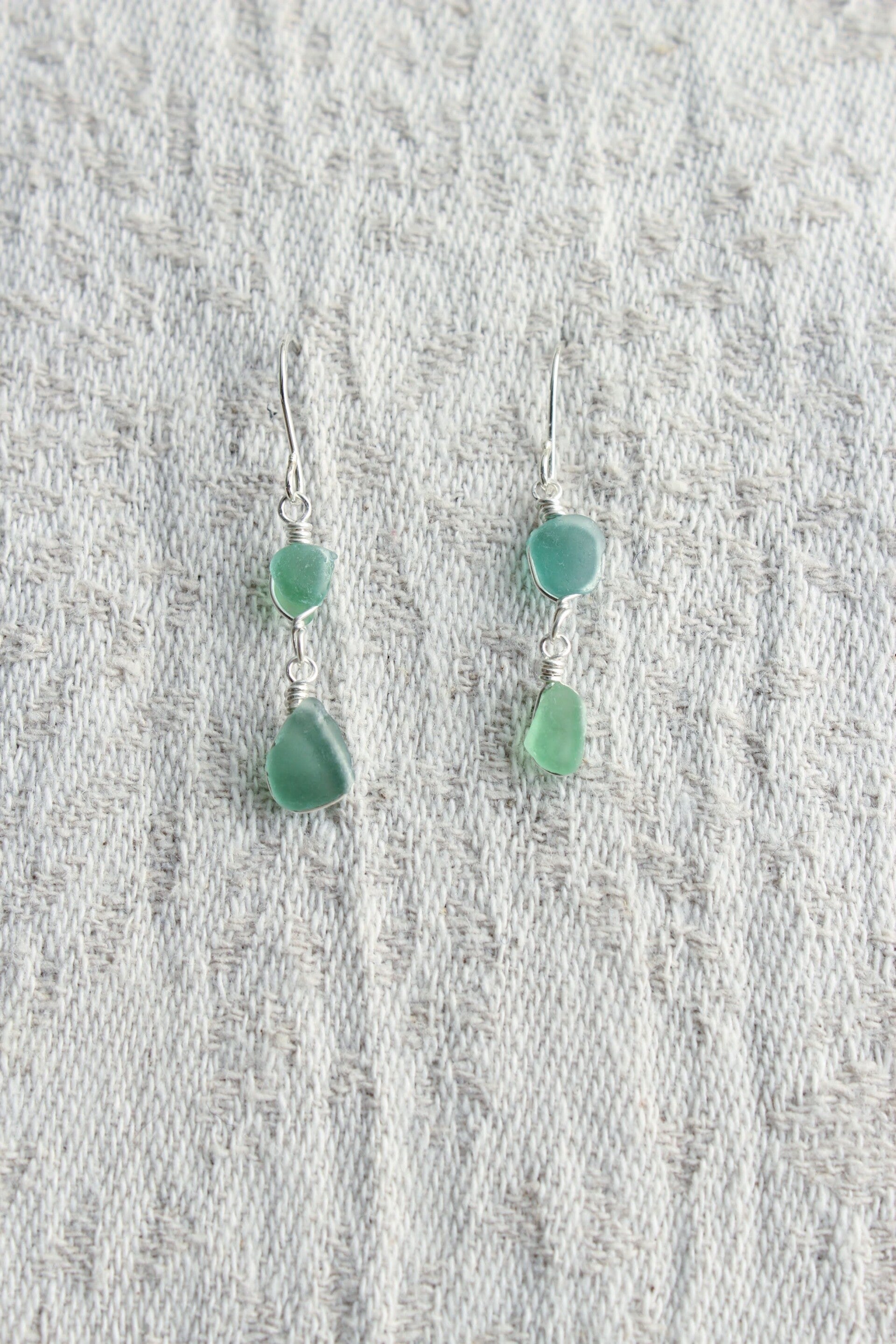 Boucles d'oreilles en fragments de verre bleu & vert d'eau récoltés dans le lac Léman, en Suisse. Fait à la main avec du fil en argent Sterling.