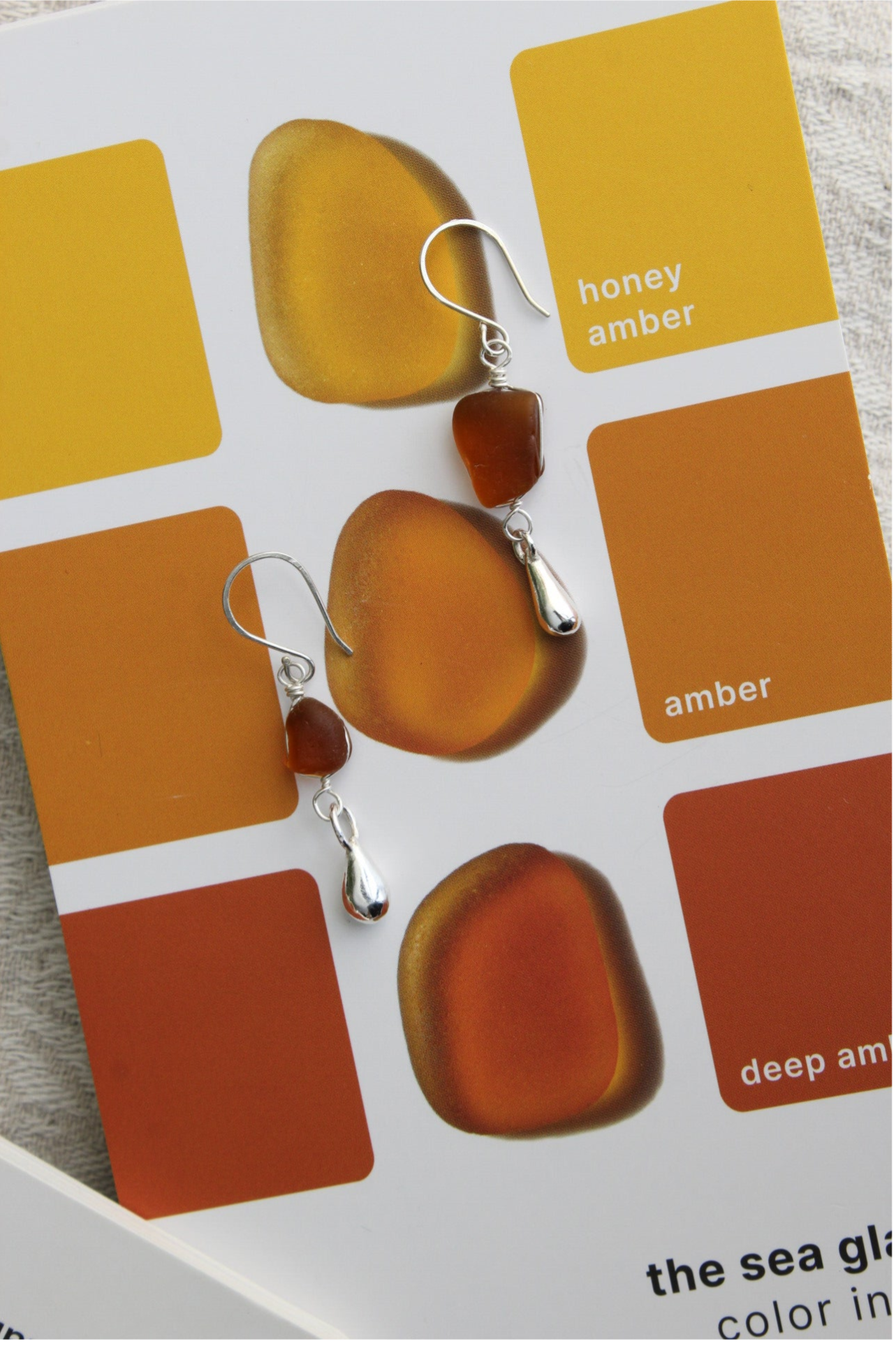 Earrings made with amber glass shards collected in Lake Léman, Switzerland. Hand made with Sterling silver wire and fine silver drop charms.