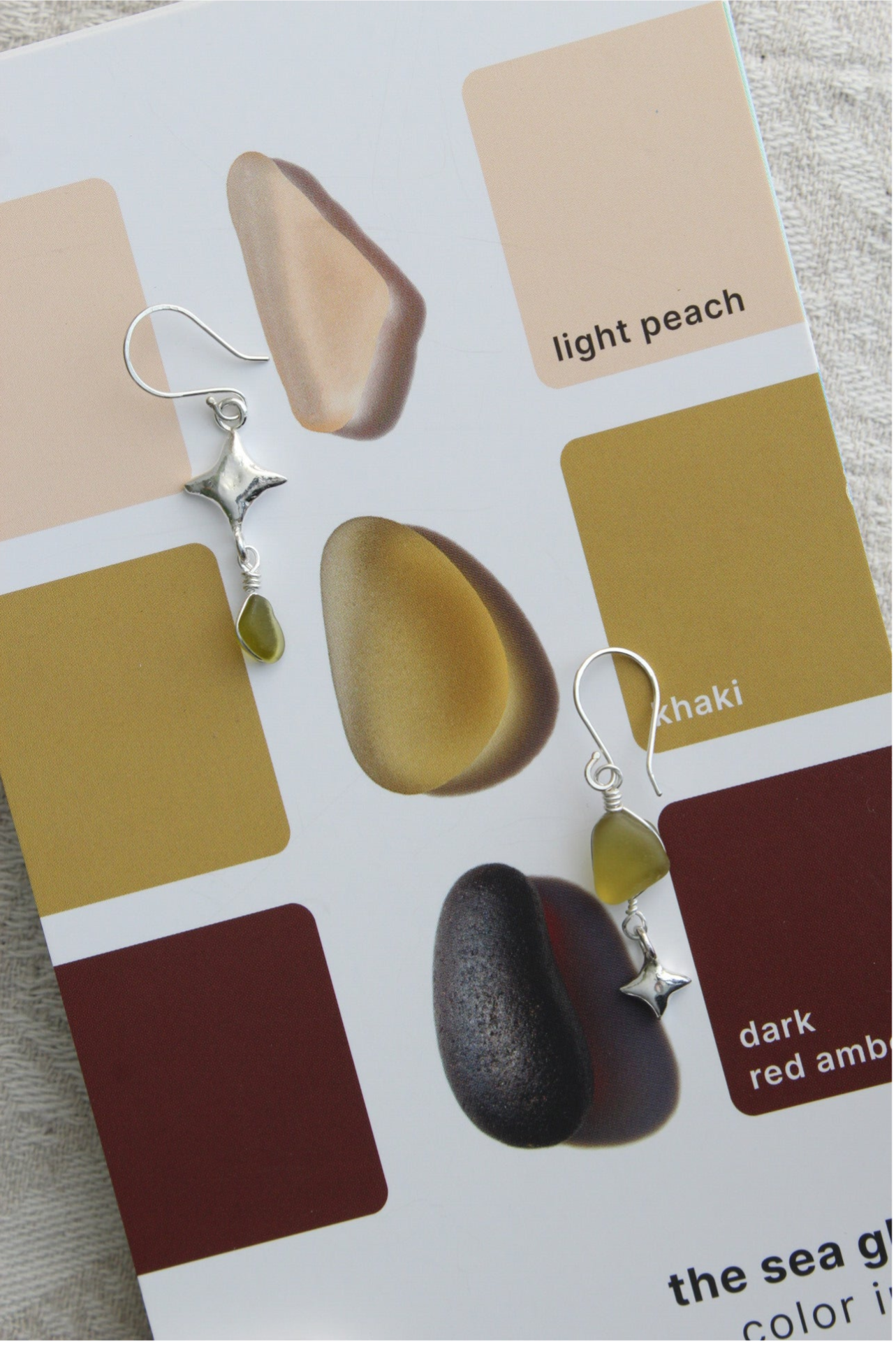 Boucles d'oreilles en fragments de verre jaune kakhi récolté dans le lac Léman, en Suisse. Fait à la main avec du fil en argent Sterling et des pendants étoiles en argent fin.