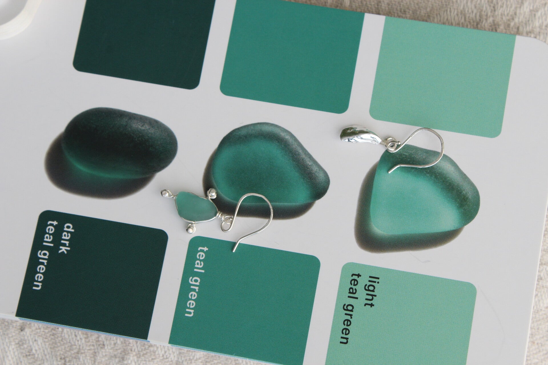 Boucles d'oreilles composé d'un fragment de verre bleu récolté dans le lac Léman, en Suisse, et d'un pendant moule en argent fin. Fait à la main avec du fil et des perles en argent Sterling.
