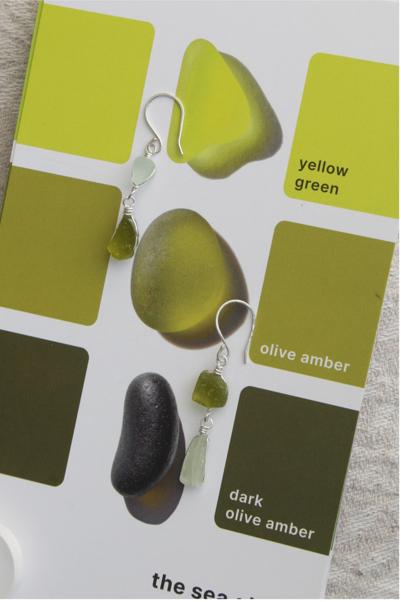 Boucles d'oreilles en fragments de verre jaune kaki & céladon pâle récoltés dans le lac Léman, en Suisse. Fait à la main avec du fil en argent Sterling.