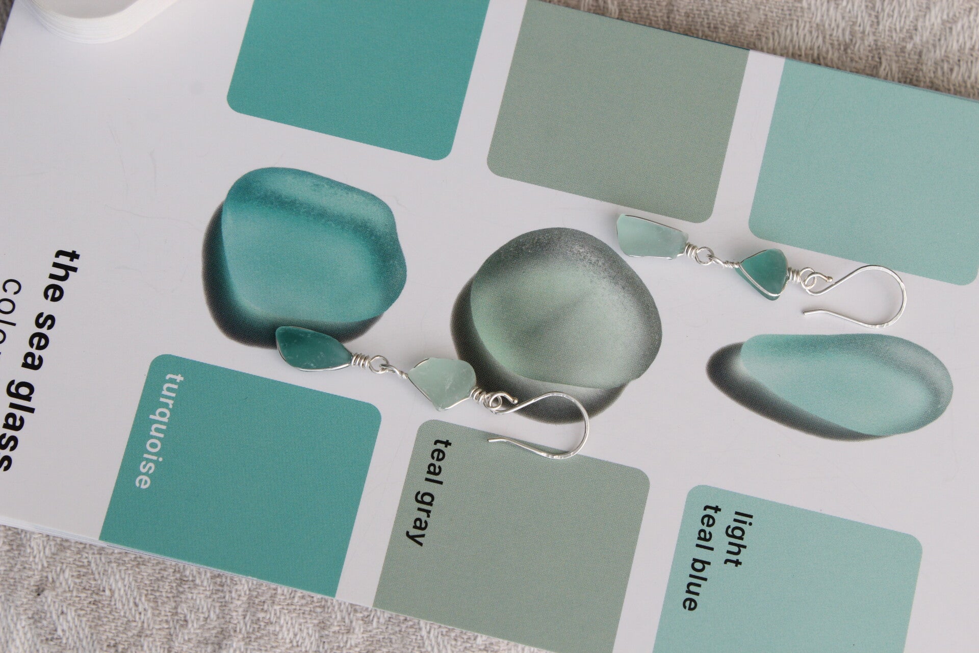 Boucles d'oreilles en fragments de verre bleu récoltés dans le lac Léman, en Suisse. Fait à la main avec du fil en argent Sterling.