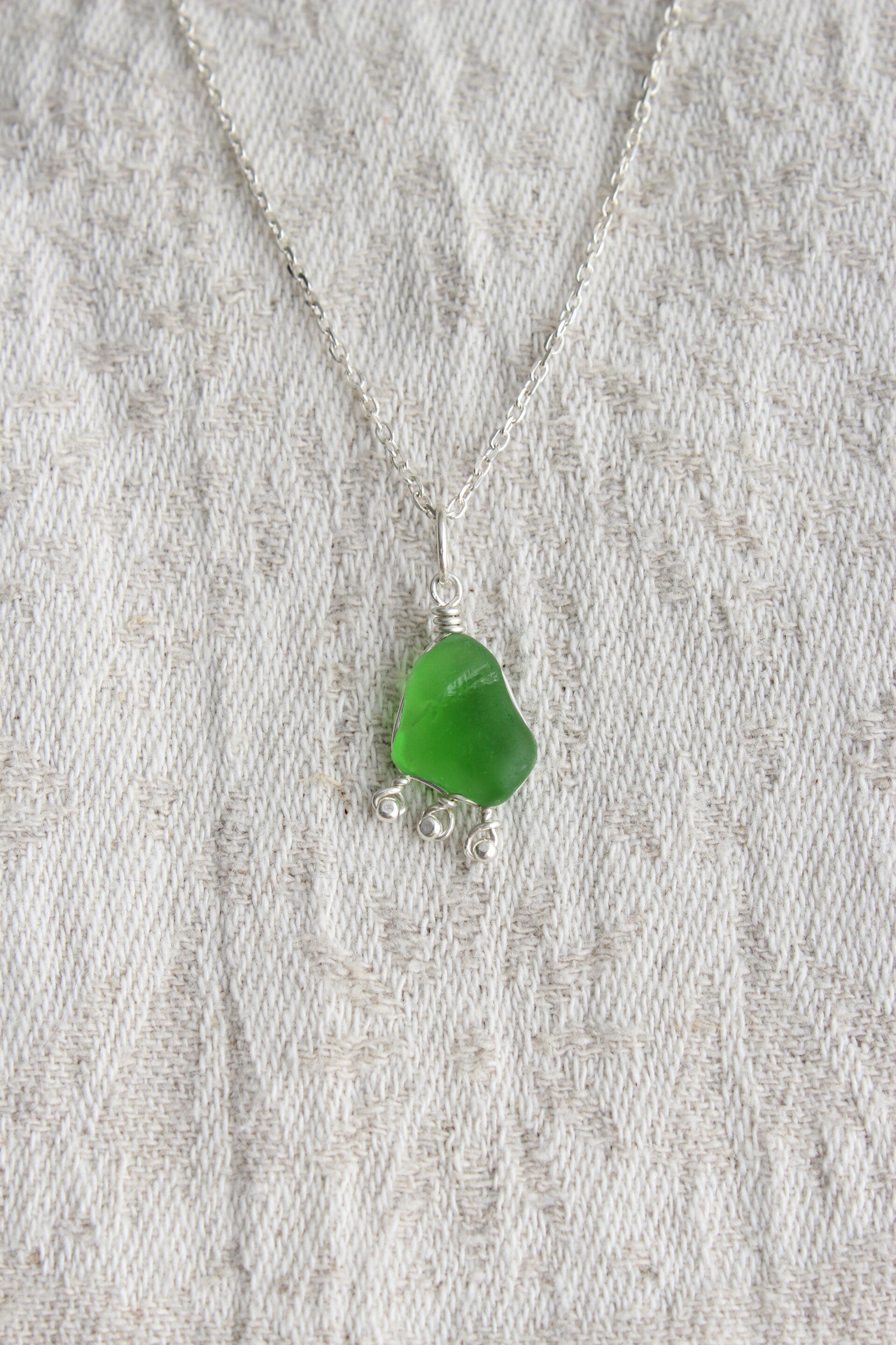 Pendant made with a emerald green glass shard that was collected in Lake Léman, Switzerland. Hand made with Sterling silver beads and wire.