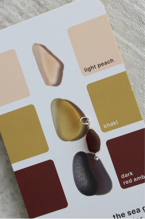 Pendentif réalisé avec un fragment de verre brun foncé récolté dans le lac Léman, en Suisse. Fait à la main avec du fil et des perles en argent Sterling.