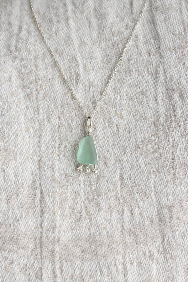 Pendant made with a pale seafoam green glass shard that was collected in Lake Léman, Switzerland. Hand made with Sterling silver beads and wire.