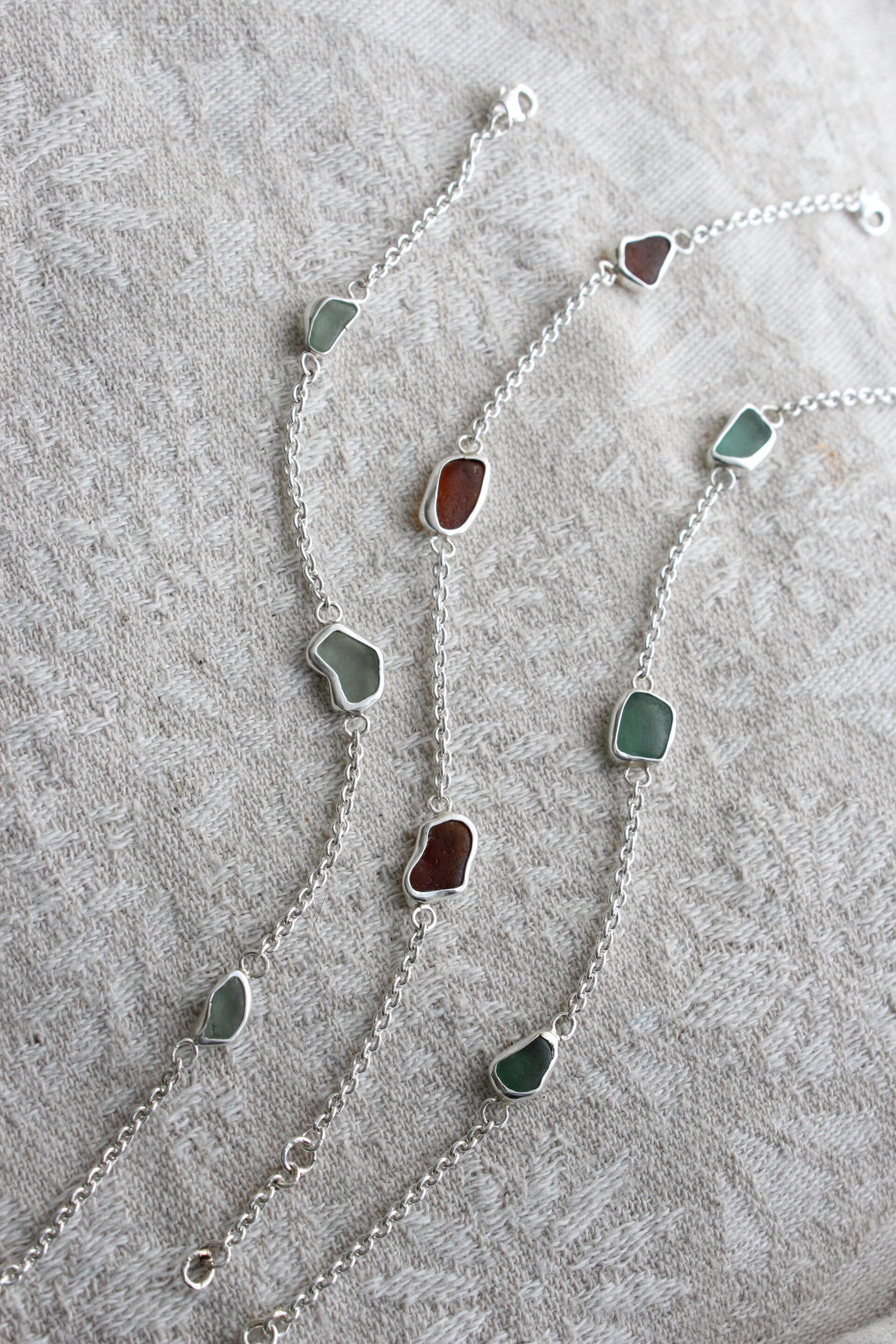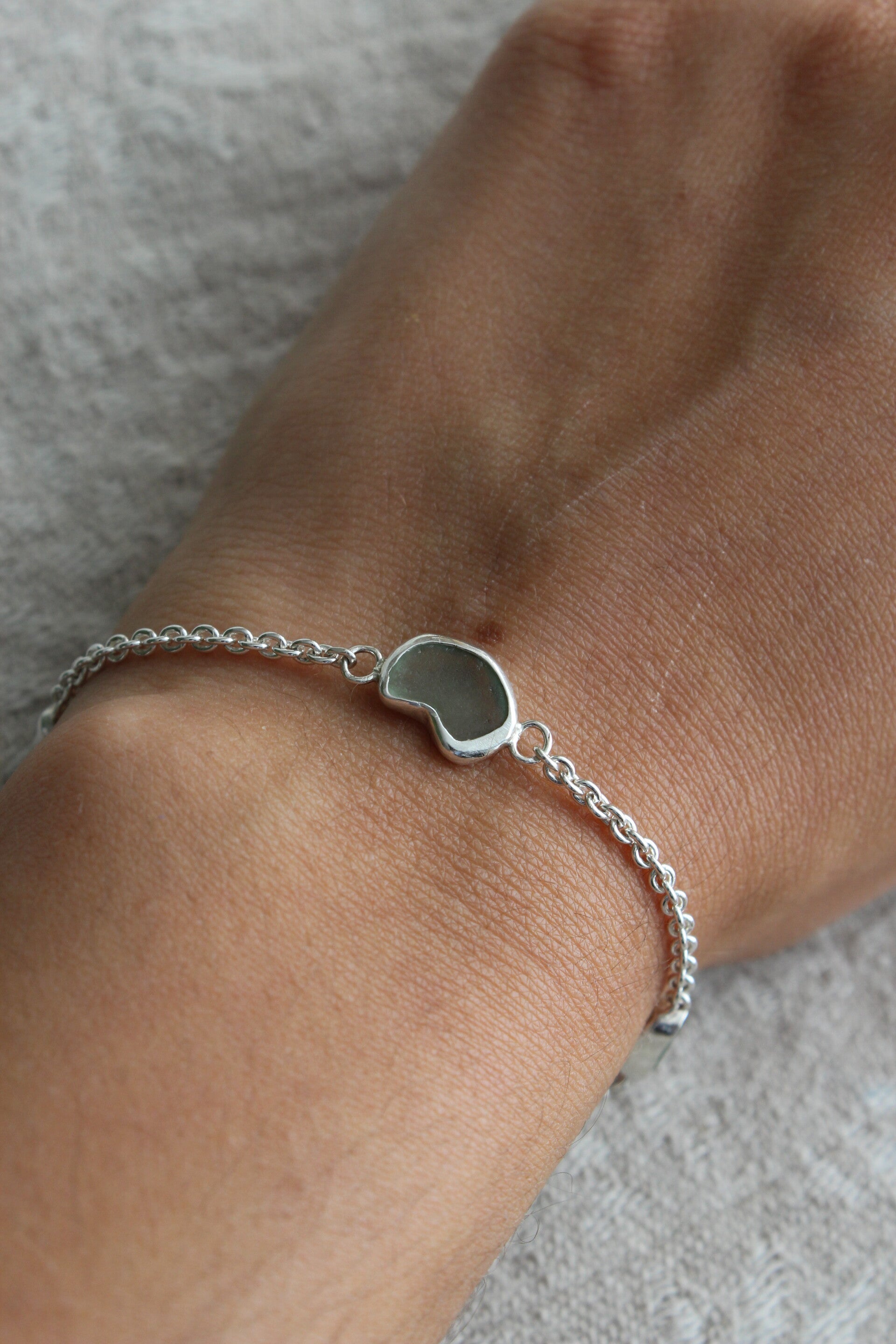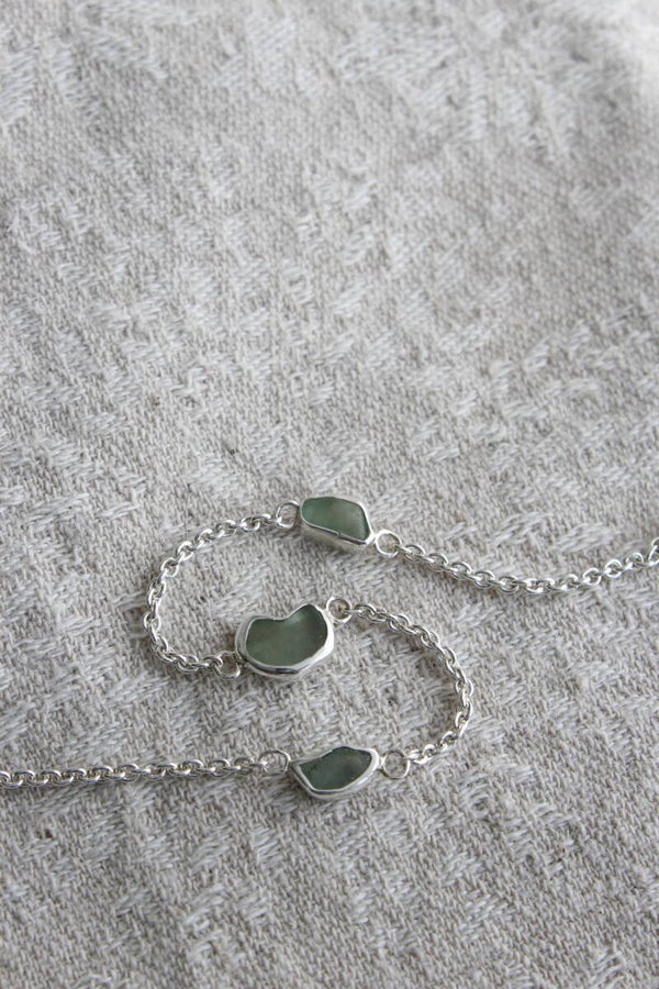 Bracelet made with Sterling silver and seagreen glass shards collected in Lake Léman, Switzerland.