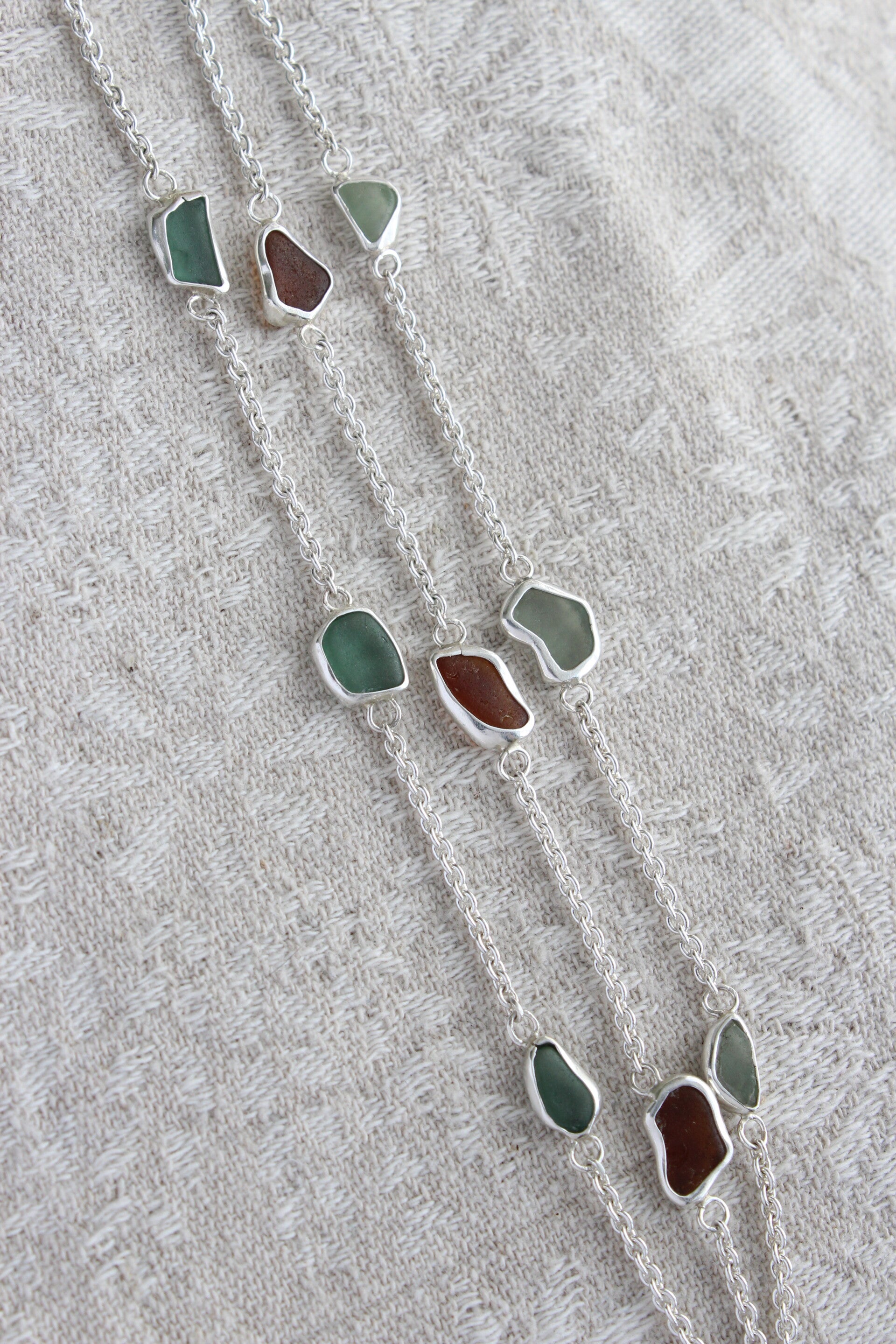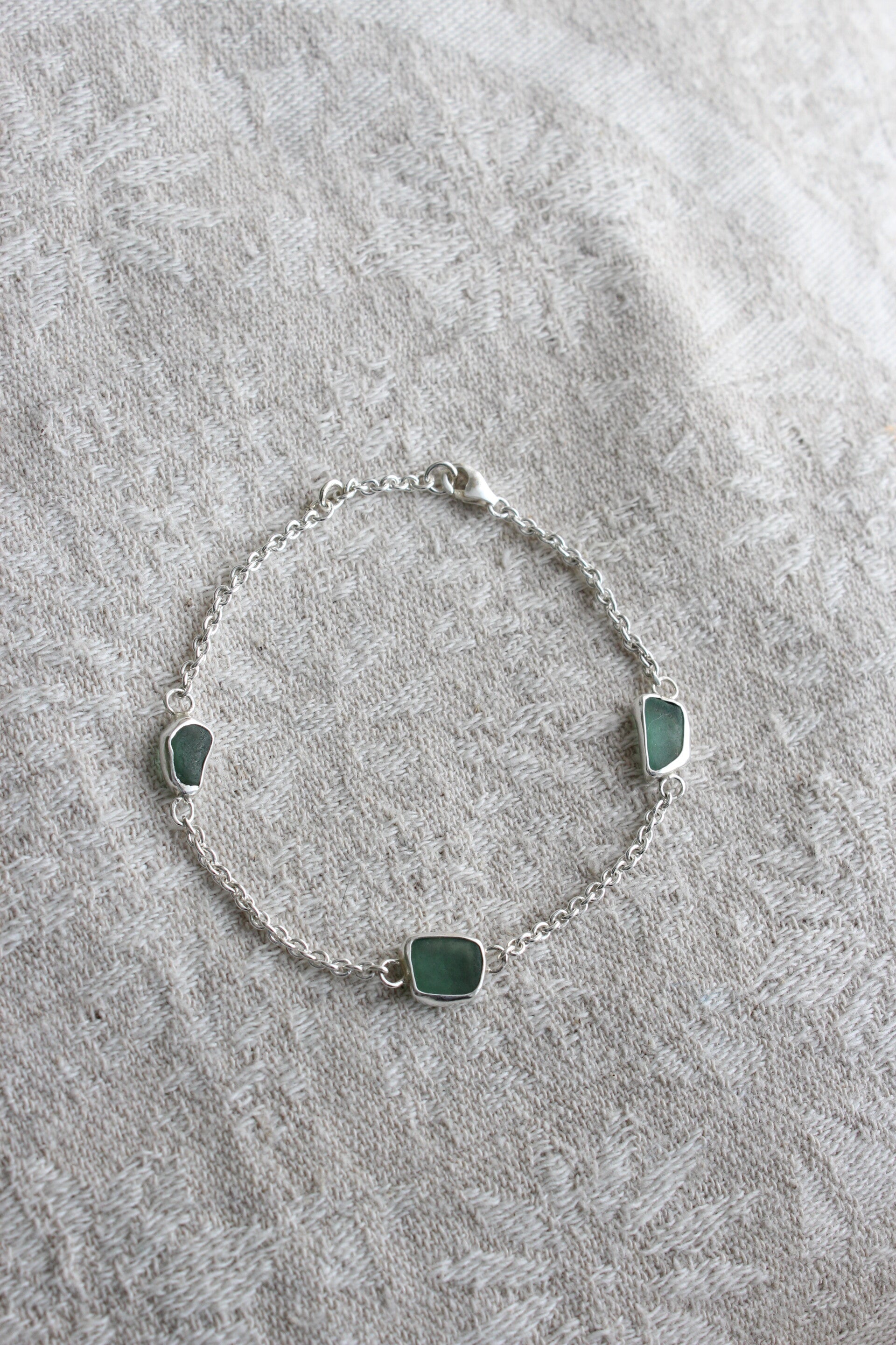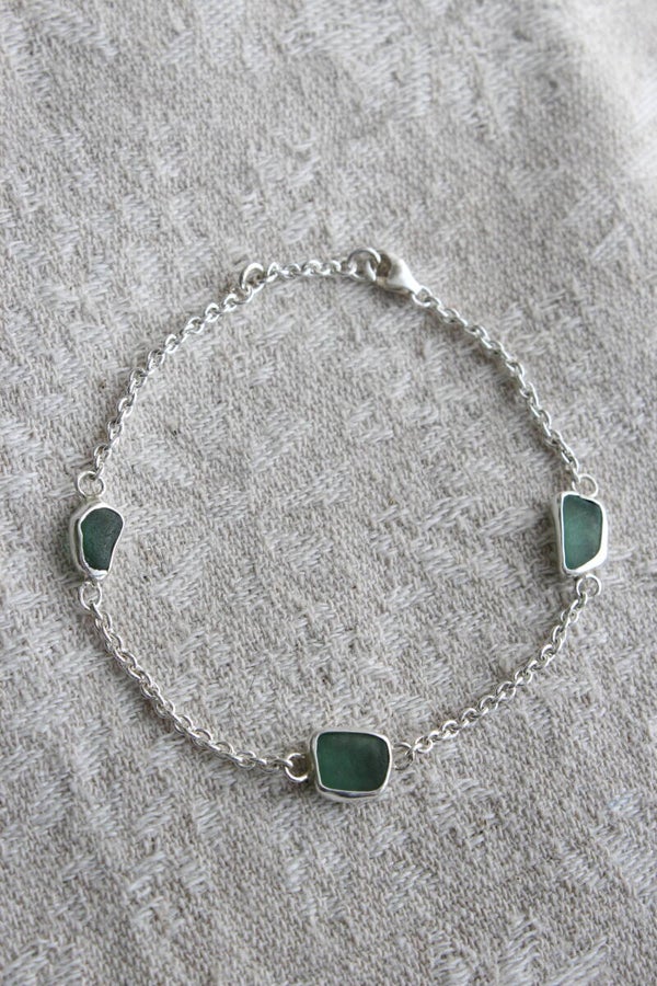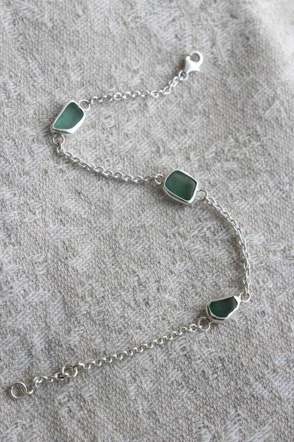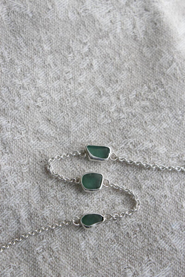 Bracelet made with Sterling silver and blue-green glass shards collected in Lake Léman, Switzerland.