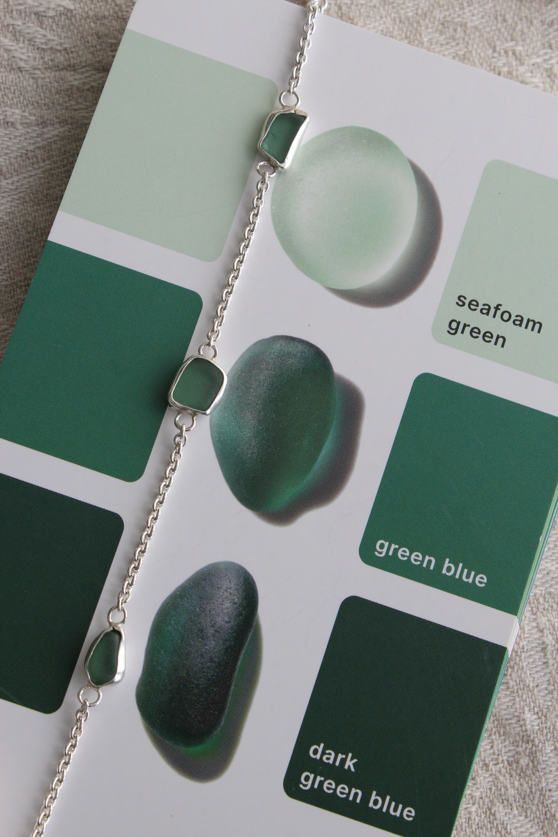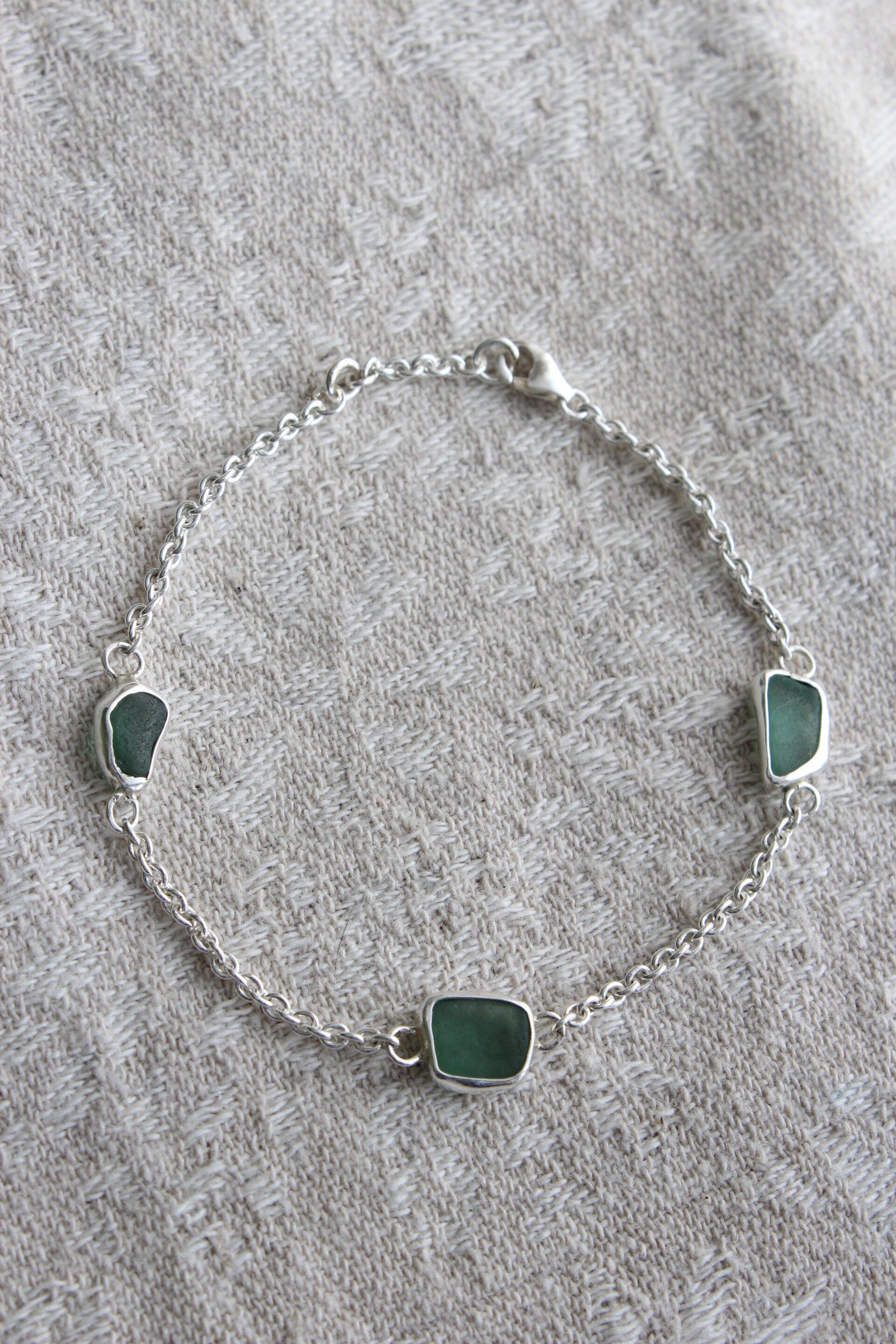 Bracelet en argent Sterling et fragments de verre bleu-vert récoltés dans le lac Léman, en Suisse.